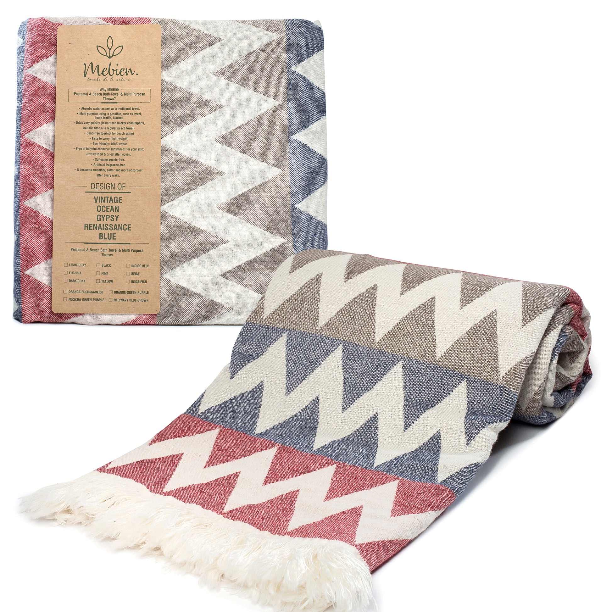 Blue Grey Red Turkish Beach Towel (35”x67”) Lightweight, Quick drying and Sand Free Can be Used as Beach Blanket 100% Cotton ZigZag Design